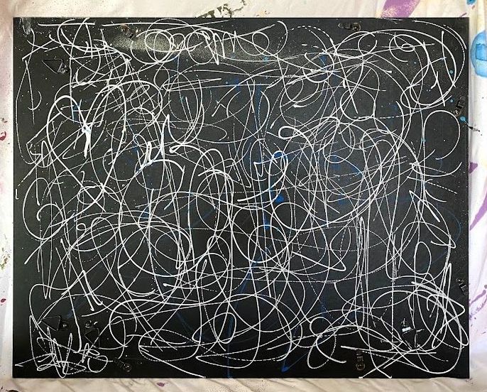 Presto pen, acrylic paint, spray paint on repurposed particle board. 16" x 20"